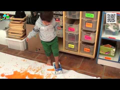 Pintamos primero con nuestros pies y observamos como son nuestras huellas, luego con cartones de leche simulamos las huellas de un robot para compararlas con las nuestras.